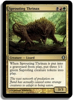 When Sprouting Thrinax is put into a graveyard from play, put three 1/1 green Saproling creature tokens into play.