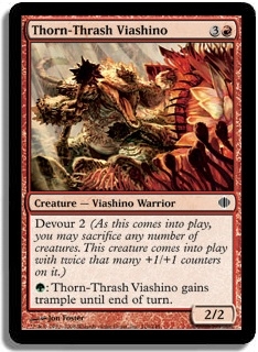Devour 2 (As this comes into play, you may sacrifice any number of creatures. This creature comes into play with twice that many +1/+1 counters on it.) G: Thorn-Thrash Viashino gains trample until end of turn.