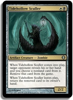 When Tidehollow Sculler comes into play, target opponent reveals his or her hand and you choose a nonland card from it. Remove that card from the game. When Tidehollow Sculler leaves play, return the removed card to its owner's hand.