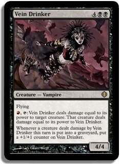 Flying R, T Vein Drinker deals damage equal to its power to target creature. That creature deals damage equal to its power to Vein Drinker. Whenever a creature dealt damage by Vein Drinker this turn is put into a graveyard, put a +1/+1 counter on Vein Drinker.