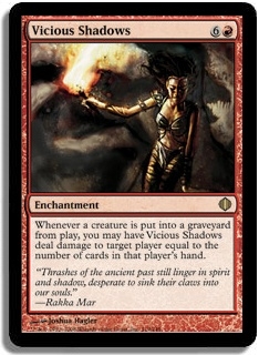 Whenever a creature is put into a graveyard from play, you may have Vicious Shadows deal damage to target player equal to the number of cards in that player's hand.