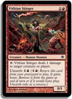 T Vithian Stinger deals 1 damage to target creature or player. Unearth 1R (1R: Return this card from your graveyard to play. It gains haste. Remove it from the game at end of turn or if it would leave play. Unearth only as a sorcery.)