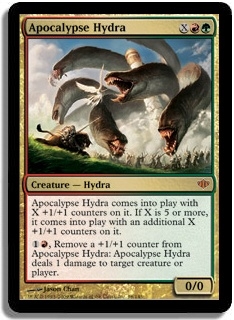 Apocalypse Hydra comes into play with X +1/+1 counters on it. If X is 5 or more, it comes into play with an additional X +1/+1 counters on it. 1R, Remove a +1/+1 counter from Apocalypse Hydra: Apocalypse Hydra deals 1 damage to target creature or player.