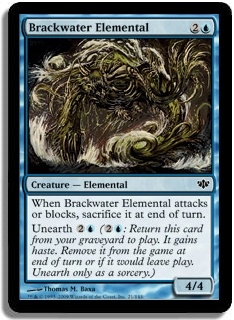 When Brackwater Elemental attacks or blocks, sacrifice it at end of turn. Unearth 2U (2U: Return this card from your graveyard to play. It gains haste. Remove it from the game at end of turn or if it would leave play. Unearth only as a sorcery.)