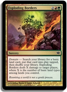 Domain - Search your library for a basic land card, put that card into play tapped, then shuffle your library. Exploding Borders deals X damage to target player, where X is the number of basic land types among lands you control.