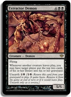 Flying Whenever another creature leaves play, you may have target player put the top two cards of his or her library into his or her graveyard. Unearth 2B (2B: Return this card from your graveyard to play. It gains haste. Remove it from the game at end of turn or if it would leave play. Unearth only as a sorcery.)