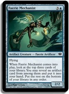 Flying When Faerie Mechanist comes into play, look at the top three cards of your library. You may reveal an artifact card from among them and put it into your hand. Put the rest on the bottom of your library in any order.