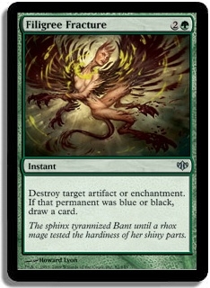 Destroy target artifact or enchantment. If that permanent was blue or black, draw a card.