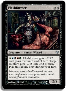 WUBRG: Fleshformer gets +2/+2 and gains fear until end of turn. Target creature gets -2/-2 until end of turn. Play this ability only during your turn.