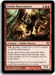 1R, Sacrifice a land: Put a +1/+1 counter on Goblin Razerunners. At the end of your turn, you may have Goblin Razerunners deal damage equal to the number of +1/+1 counters on it to target player.