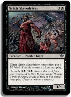 When Grixis Slavedriver leaves play, put a 2/2 black Zombie creature token into play. Unearth 3B (3B: Return this card from your graveyard to play. It gains haste. Remove it from the game at end of turn or if it would leave play. Unearth only as a sorcery.)