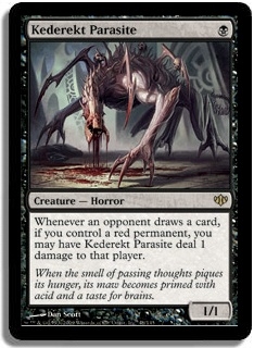 Whenever an opponent draws a card, if you control a red permanent, you may have Kederekt Parasite deal 1 damage to that player.