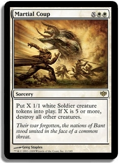 Put X 1/1 white Soldier creature tokens into play. If X is 5 or more, destroy all other creatures.