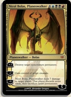 +3: Destroy target noncreature permanent. -2: Gain control of target creature. -9: Nicol Bolas, Planeswalker deals 7 damage to target player. That player discards seven cards, then sacrifices seven permanents.