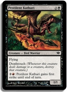 Flying Deathtouch (Whenever this creature deals damage to a creature, destroy that creature.) 2R: Pestilent Kathari gains first strike until end of turn.