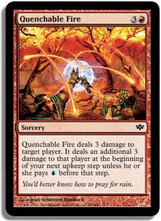 Quenchable Fire deals 3 damage to target player. It deals an additional 3 damage to that player at the beginning of your next upkeep step unless he or she pays U before that step.