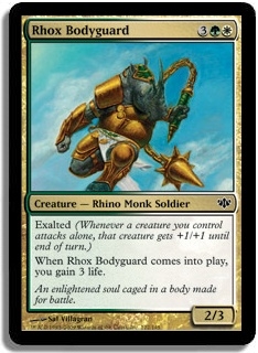 Exalted (Whenever a creature you control attacks alone, that creature gets +1/+1 until end of turn.) When Rhox Bodyguard comes into play, you gain 3 life.