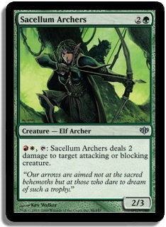 RW, T Sacellum Archers deals 2 damage to target attacking or blocking creature.