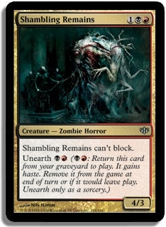 Shambling Remains can't block. Unearth BR (BR: Return this card from your graveyard to play. It gains haste. Remove it from the game at end of turn or if it would leave play. Unearth only as a sorcery.)