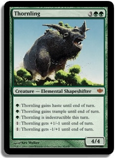 G: Thornling gains haste until end of turn. G: Thornling gains trample until end of turn. G: Thornling is indestructible this turn. 1: Thornling gets +1/-1 until end of turn. 1: Thornling gets -1/+1 until end of turn.