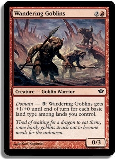 Domain - 3: Wandering Goblins gets +1/+0 until end of turn for each basic land type among lands you control.