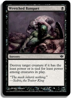 Destroy target creature if it has the least power or is tied for least power among creatures in play.