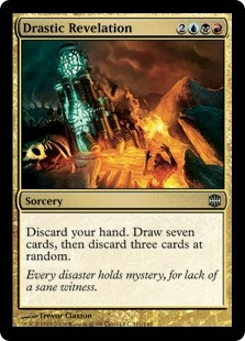 Discard your hand. Draw seven cards, then discard three cards at random.