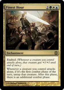 Exalted (Whenever a creature you control attacks alone, that creature gets +1/+1 until end of turn.) Whenever a creature you control attacks alone, if it's the first combat phase of the turn, untap that creature. After this phase, there is an additional combat phase.