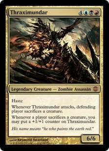 Haste Whenever Thraximundar attacks, defending player sacrifices a creature. Whenever a player sacrifices a creature, you may put a +1/+1 counter on Thraximundar.