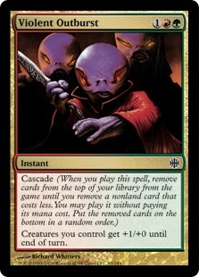 Cascade (When you play this spell, remove cards from the top of your library from the game until you remove a nonland card that costs less. You may play it without paying its mana cost. Put the removed cards on the bottom in a random order.) Creatures you control get +1/+0 until end of turn.