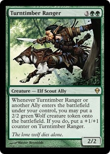 Whenever Turntimber Ranger or another Ally enters the battlefield under your control, you may put a 2/2 green Wolf creature token onto the battlefield. If you do, put a +1/+1 counter on Turntimber Ranger.
