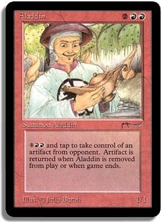 <1RR> and tap to take control of an artifact from opponent. Artifact is returned when Aladdin is removed from play or when game ends.