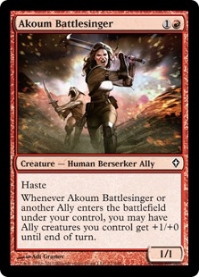 Haste Whenever Akoum Battlesinger or another Ally enters the battlefield under your control, you may have Ally creatures you control get +1/+0 until end of turn.