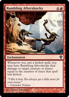 Whenever you cast a kicked spell, you may have Rumbling Aftershocks deal damage to target creature or player equal to the number of times that spell was kicked.