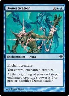 Enchant creature You control enchanted creature. At the beginning of your end step, if enchanted creature's power is 4 or greater, sacrifice Domestication.
