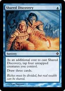 As an additional cost to cast Shared Discovery, tap four untapped creatures you control. Draw three cards.