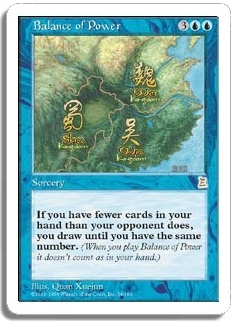 If you have fewer cards in your hand than your opponent does, draw until you have the same number.(When you play Balance of Power, it doesn't count as in your hand.)