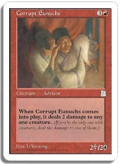When Corrupt Eunuchs comes into play, it deals 2 damage to any one creature. (If you're the only one with creatures, deal the damage to one of them.)