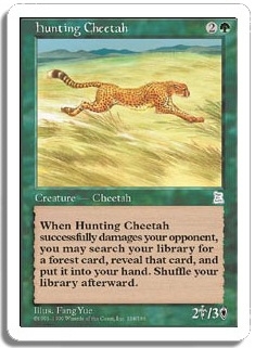 When Hunting Cheetah successfully damages your opponent, you may search your library for a forest card, reveal that card, and put it into your hand. Shuffle your library afterward.