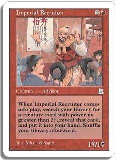 When Imperial Recruiter comes into play, search your library for a creature card with power no greater than 2, reveal that card, and put it into your hand. Shuffle your library afterward.