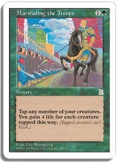 Tap any number of your creatures. You gain 4 life for each creature tapped this way. (Tapped creatures can't block.)