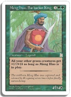 All your other green creatures get +1/+1 as long as Meng Huo is in play.