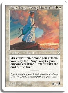 On your turn, before you attack, you may tap Pang Tong to give any one creature +0/+2 until the end of the turn.