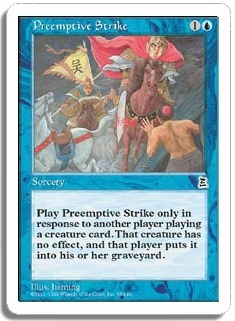 Play Preemptive Strike only in response to another player playing a creature card. That creature has no effect, and that player puts it into his or her graveyard.