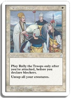 Play Rally the Troops only after you're attacked, before you declare blockers. Untap all your creatures.