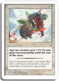 Any one creature gets +3/+3 and gains horsemanship until the end of the turn.