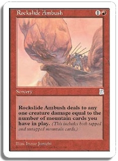 Rockslide Ambush deals to any one creature damage equal to the number of mountain cards you have in play. (This includes both tapped and untapped mountain cards.)