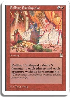 Rolling Earthquake deals X damage to each player and each creature without horsemanship. (This includes you and your creatures without horsemanship.)