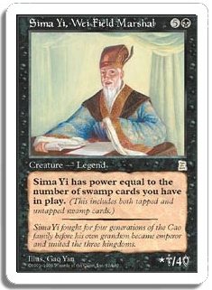 Sima Yi has power equal to the number of swamp cards you have in play. (This includes both tapped and untapped swamp cards.)