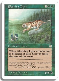 When Slashing Tiger attacks and is blocked, it gets +2/+2 until the end of the turn.